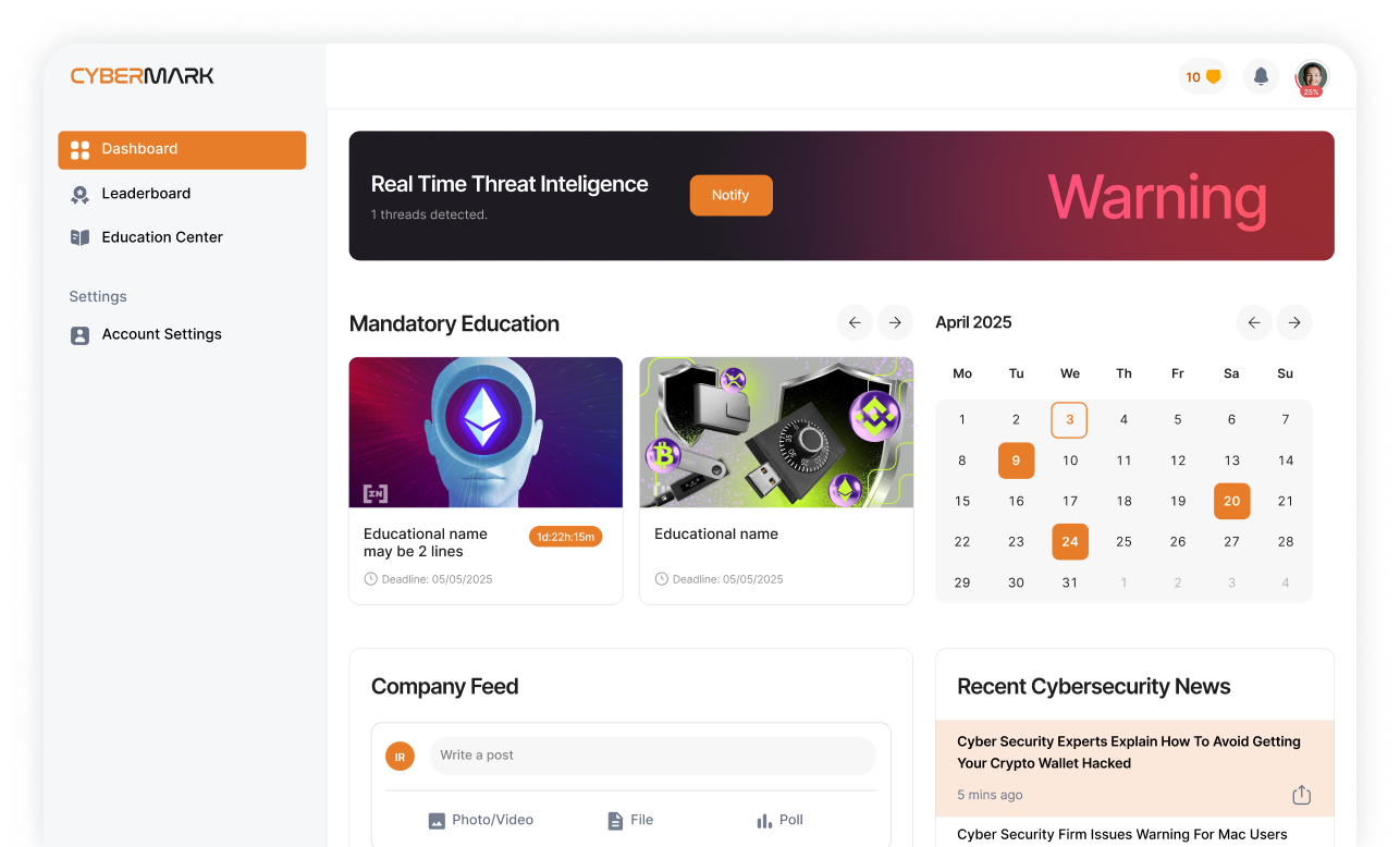 Cybermark reduces human risk before attacks happen. AI-driven, personalized trainings, phissing attacks and real time threat reporting tools keeps employees alert—without adding work for your security team.