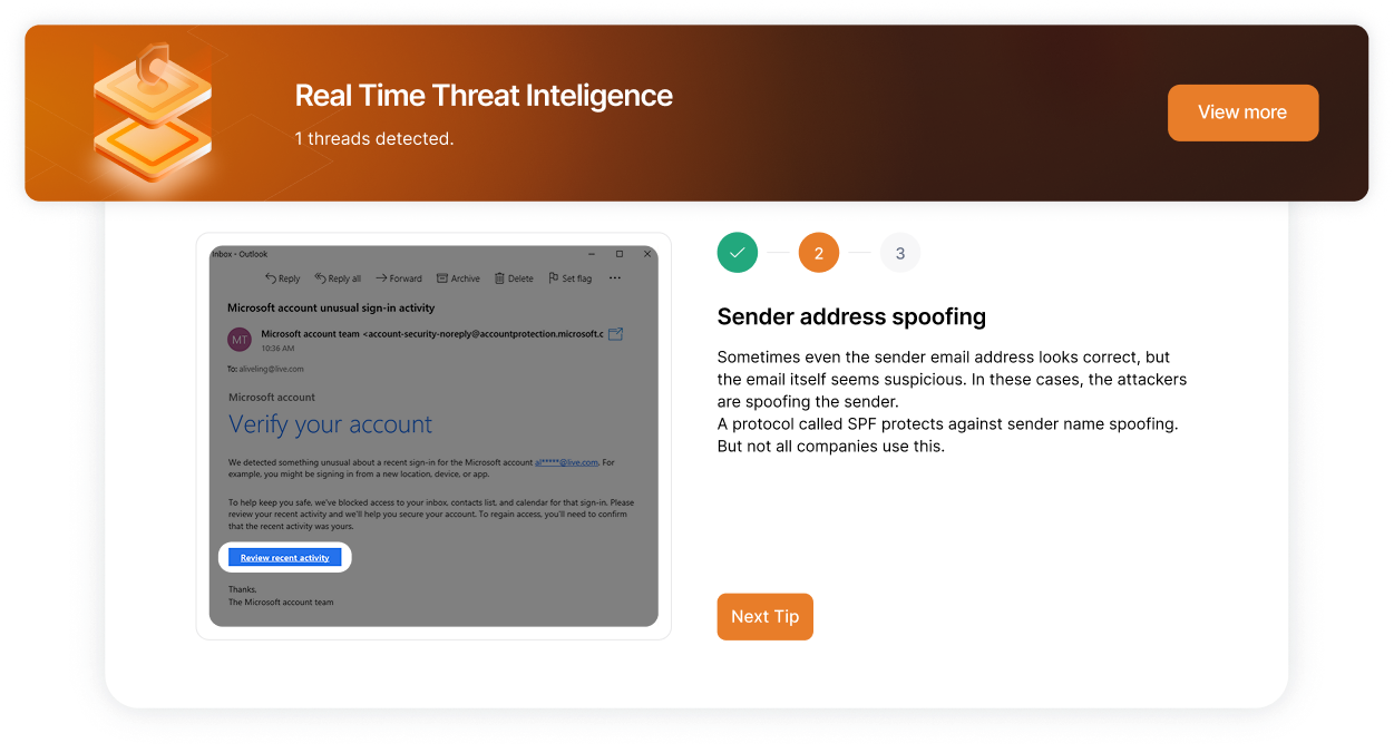 Get relevant real-time insights into phishing attacks happening across our wide customer network. Report threats instantly, and let our Cyber-AI detect, flag, and block them automatically.